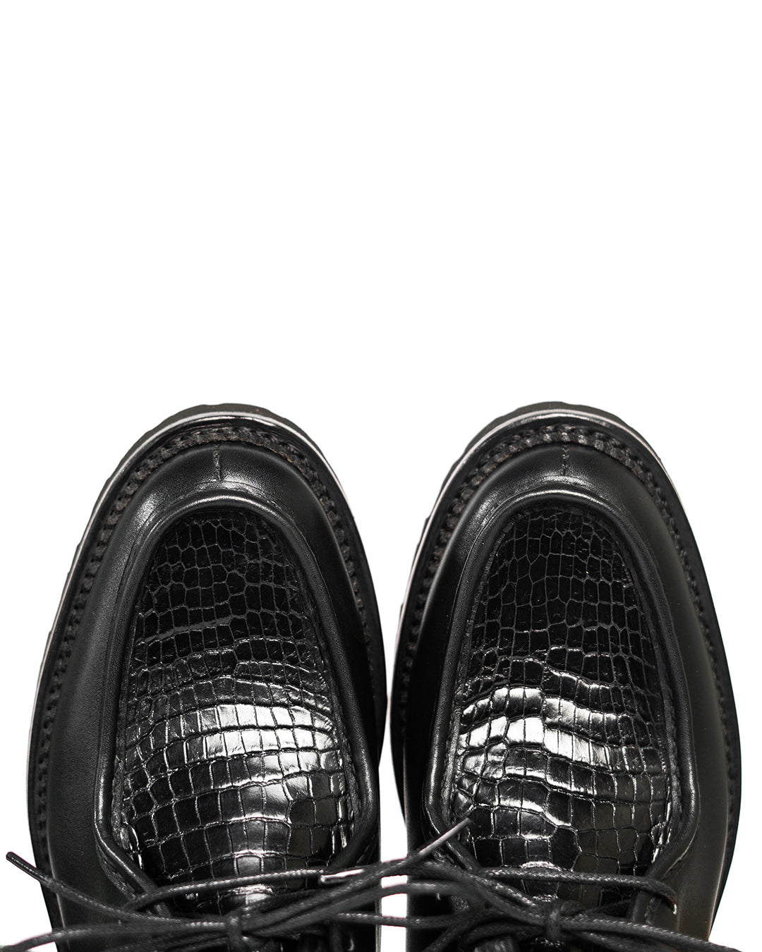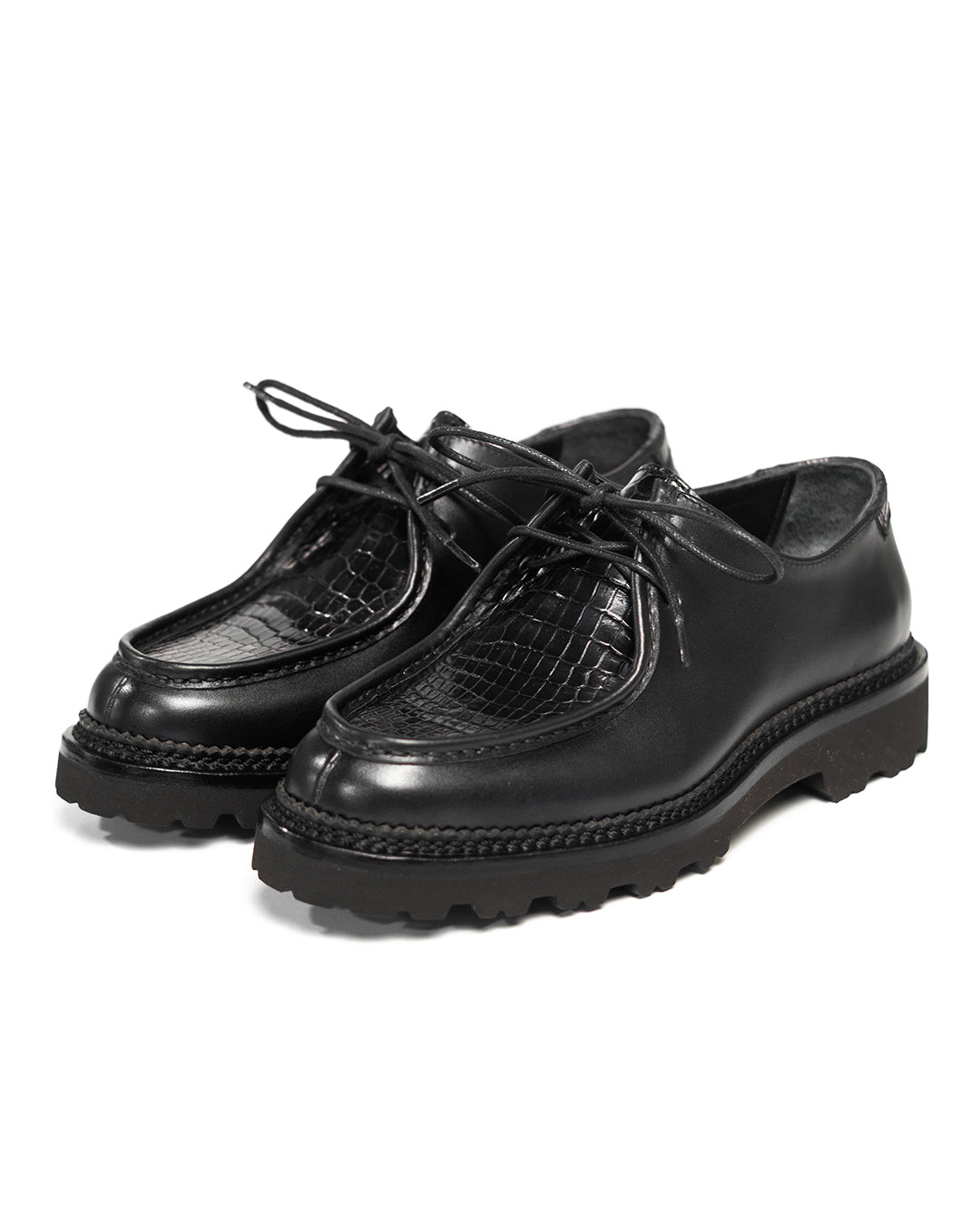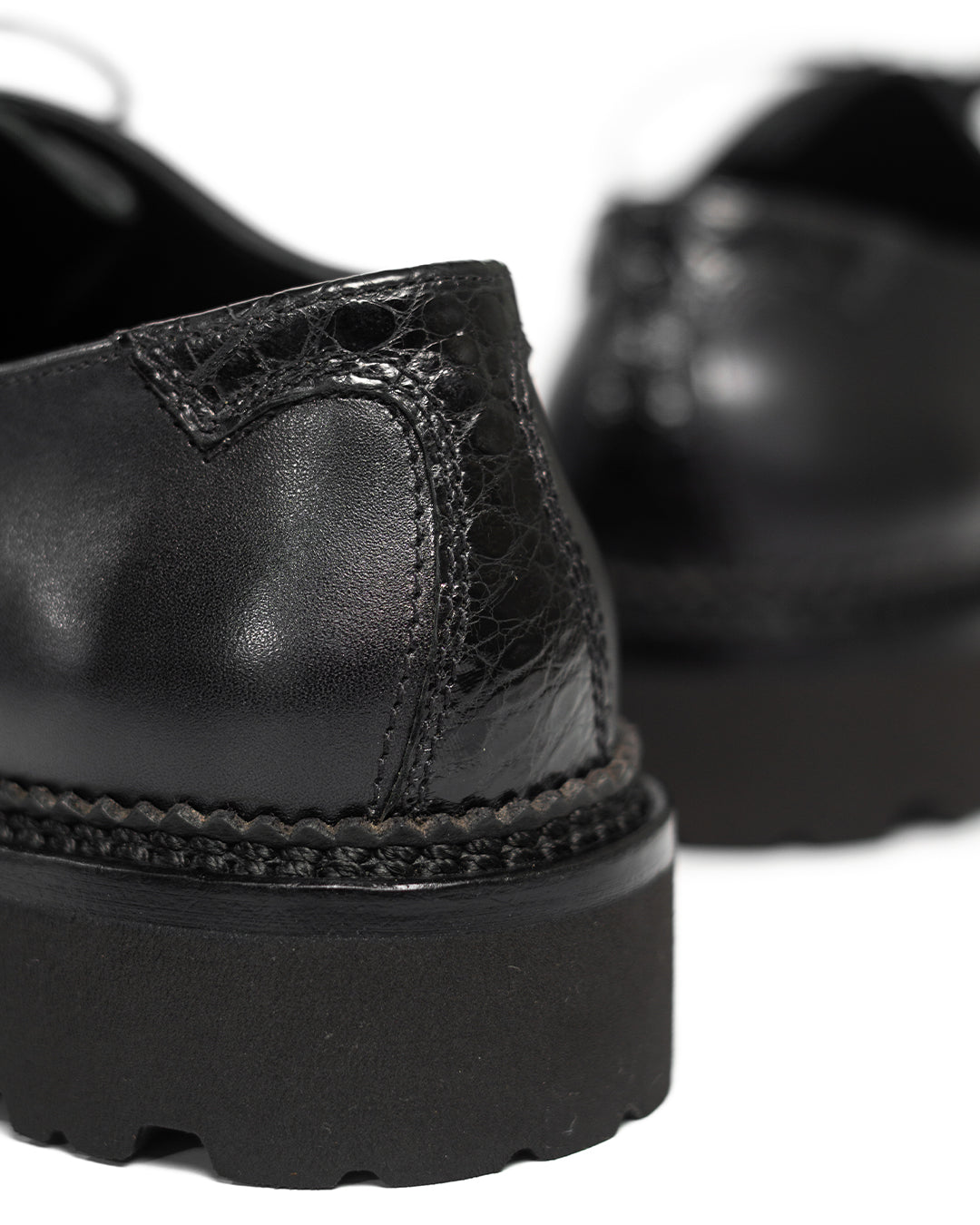 #SagaraTyrolean crafted with Chateaubriand calf leather from French Tanneries, Du Puy, combined with Baby Crocodile Porosus leather on the apron and backstay. Baby Porosus has that fine, small-scale pattern that gives a luxurious and unique texture, blending nicely with the smooth satin finish of the calf.